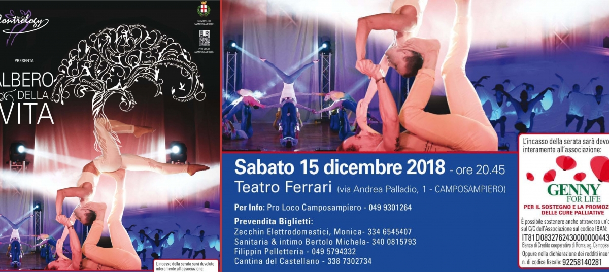 Camposampiero sabato 15 dicembre organizza alle ore 20.45 al teatro Ferrari di Camposampiero uno spettacolo dal nome: ALBERO DELLA VITA il cui ricavato sarà devoluto all’associazione Genny for life. Questa associazione si occupa di sostenere e promozionale le cure palliative. Nata nel 2013 dall’Azienda Ulss 15 Non ha scopo di lucro e persegue finalità di solidarietà a favore di persone con malattia inguaribile in fase avanzata e delle loro famiglie. L'associazione si prefigge di: sviluppare e sostenere le iniziative sanitarie, assistenziali e sociali volte ad applicare efficacemente le cure palliative; promuovere e sostenere iniziative di formazione e aggiornamento professionale degli operatori; promuovere e sostenere iniziative di informazione e sensibilizzazione dell'opinione pubblica sul problema dei malati inguaribili in fase avanzata; promuovere iniziative di carattere legislativo o normativo che agevolino le esigenze dei malati in fase irreversibile; acquisire apparecchiature e fornire materiali; assicurare la presenza di volontari, formati dall'associazione, nei diversi ambiti di cura e assistenza (Hospice, Day-Hospital, ospedalizzazione domiciliare, assistenza domiciliare integrata). Biglietti acquistabili nelle prevendite del paese.