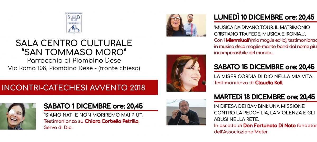 Durante il mese di dicembre la parrocchia di Piombino Dese presso la sala del centro culturale “San Tommaso Moro” mette a disposizione per la cittadinanza quattro incontri per la preparazione dell’avvento. Di seguito il programma con inizio delle serate alle ore 20.45.