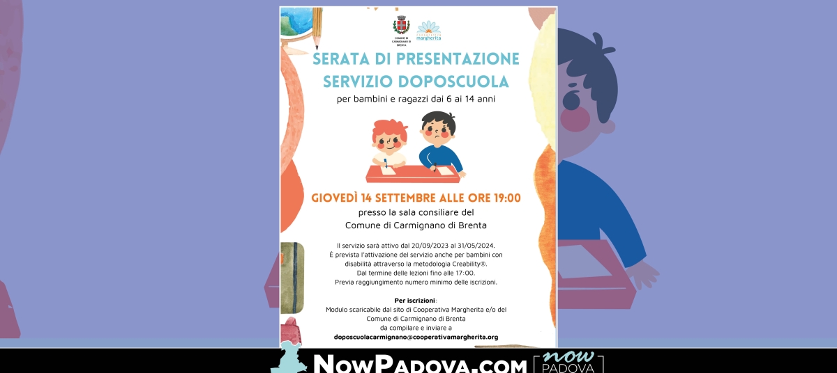 L'Amministrazione Comunale invita a partecipare all'incontro di presentazione del servizio di Doposcuola 2023, con recupero didattico e attività laboratoriali rivolto agli alunni della scuola primaria e secondaria di primo grado.All'incontro, che si svolgerà GIOVEDÌ 14 SETTEMBRE 2023 ALLE ORE 19:00 presso la sala consiliare del Comune, sarà presente Margherita Soc. Cooperativa Sociale O.N.L.U.S. che si è aggiudicata quest’anno il servizio di doposcuola e che illustrerà il progetto per l'a.s. 2023/2024. La nuova edizione del progetto Doposcuola avrà inizio Mercoledì 20 settembre 2023 presso la scuola primaria “De Amicis” via U. Foscolo n. 1/D e si svolgerà il lunedì, mercoledì, giovedì e venerdì. Vi invitiamo a partecipare all'incontro informativo di giovedì 14 settembre durante il quale vi saranno fornite tutte le informazioni utili riguardanti il servizio e le modalità di iscrizione.