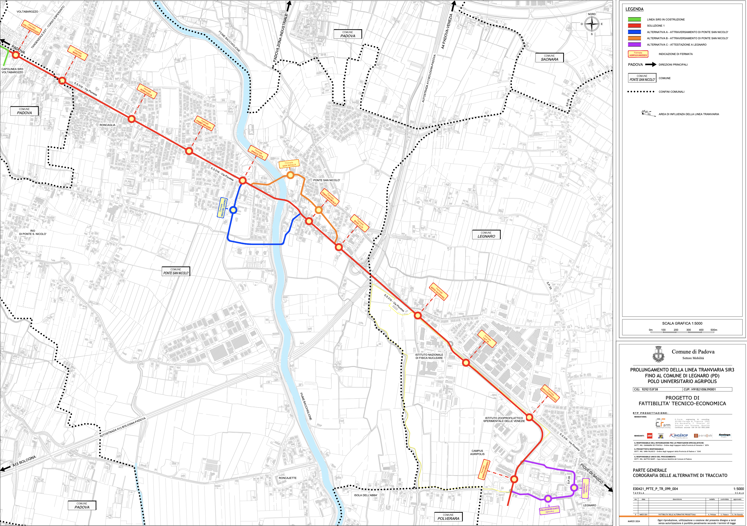 Il Sir3 verso Legnaro si fa sempre più concreto: approvato dai Comuni coinvolti il tragitto migliore per arrivare alla definizione del progetto di fattibilità tecnico economica. In questi giorni i comuni di Padova, Ponte San Nicolò e Legnaro hanno approvato una delibera riguardante l’allungamento del Sir3 fino al polo universitario di Agripolis. Come è noto la progettazione di fattibilità tecnico economica per questa tratta del Sir3 è in corso grazie all’incarico affidato circa un anno fa ad un raggruppamento di imprese la cui mandataria è E-Farm Engineering & Consulting srl. L’incarico prevedeva una prima fase in cui dovevano essere realizzate almeno tre alternative progettuali da sottoporre alla valutazione dei comuni coinvolti prima di procedere con il dettaglio della progettazione. Ci sono stati degli incontri tecnici preliminari e a seguire le imprese hanno consegnato, qualche settimana fa, le quattro proposte elaborate, che sono state attentamente valutate dalle tre amministrazioni interessate, in un confronto con i progettisti e APS Holding. Con le delibere approvate questa settimana dalle tre Giunte comunali, le amministrazioni danno mandato ai progettisti di perseguire la cosiddetta Soluzione 1 Alternativa A (vedi elaborato allegato), che prevede l’inizio della tratta in corrispondenza del capolinea Sir3 a Voltabarozzo, il proseguimento sulla SS516 – Via Piovese, la realizzazione un nuovo ponte sul Bacchiglione a sud dell’esistente, il superamento dell’autostrada A13 sul ponte esistente, la successiva entrata nel viale dell’Università, nel Comune di Legnaro, con capolinea in via Orsaretto, dove è prevista un’area a parcheggio e una rimessa coperta per i mezzi. L’alternativa individuata risponde meglio delle altre a tutte le esigenze espresse dalle amministrazioni coinvolte e ai principi presenti nel Piano Urbano di Mobilità sostenibile, dal momento che rappresenta un’infrastruttura integrata con il sistema SMART esistente, in grado di servire un bacino d’utenza più ampio possibile e allo stesso tempo permette di contenere gli impatti in termini di tempi, costi e interferenze con il contesto di inserimento. Ora i progettisti incaricati proseguiranno quindi con tutti gli approfondimenti necessari di tale soluzione per arrivare ad una consegna del progetto di fattibilità tecnico economica completo entro l’estate e quindi partecipare all’avviso ministeriale per ottenere i fondi necessari. L’assessore alla mobilità del Comune di Padova commenta: “Si tratta di un passaggio di fondamentale importanza nel percorso verso la realizzazione dell’allungamento della linea Sir3 fino al polo universitario”.