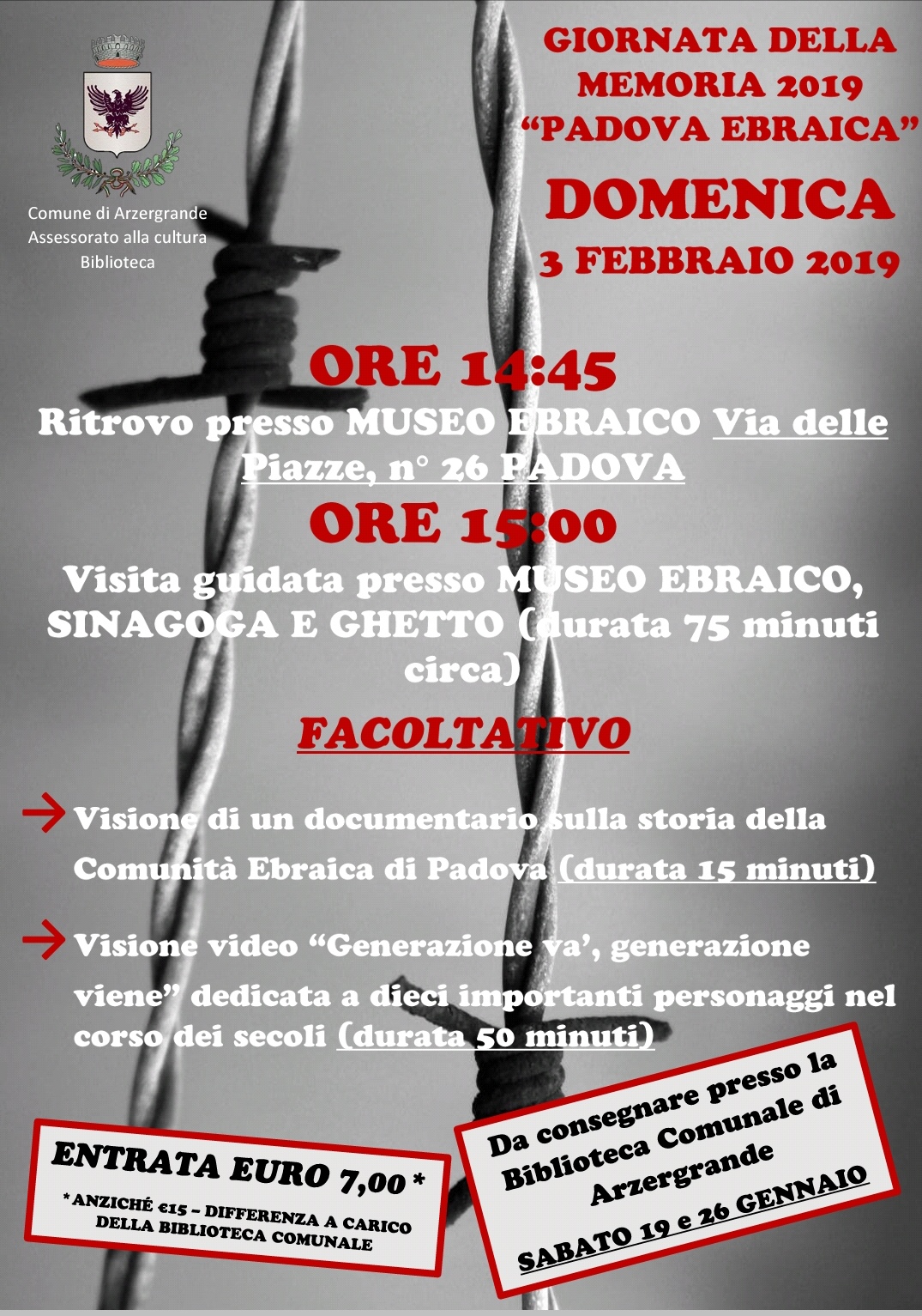 In occasione della ricorrenza della Giornata della Memoria, l'Amministrazione Comunale propone per Domenica 3 febbraio 2019 una visita guidata al Museo Ebraico, alla Sinagoga e al Ghetto di Padova. Sarà possibile anche assistere a proiezioni inerenti la storia della Comunità ebraica di Padova.