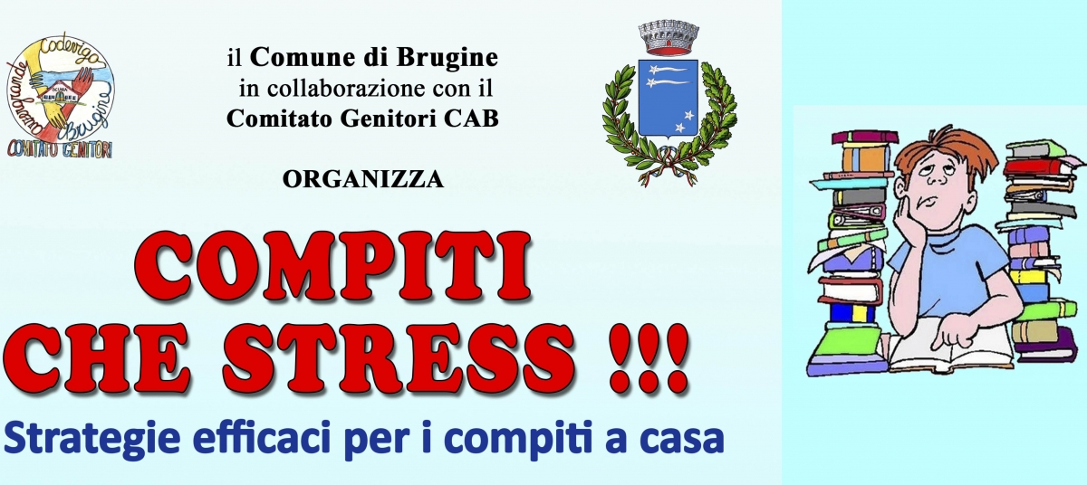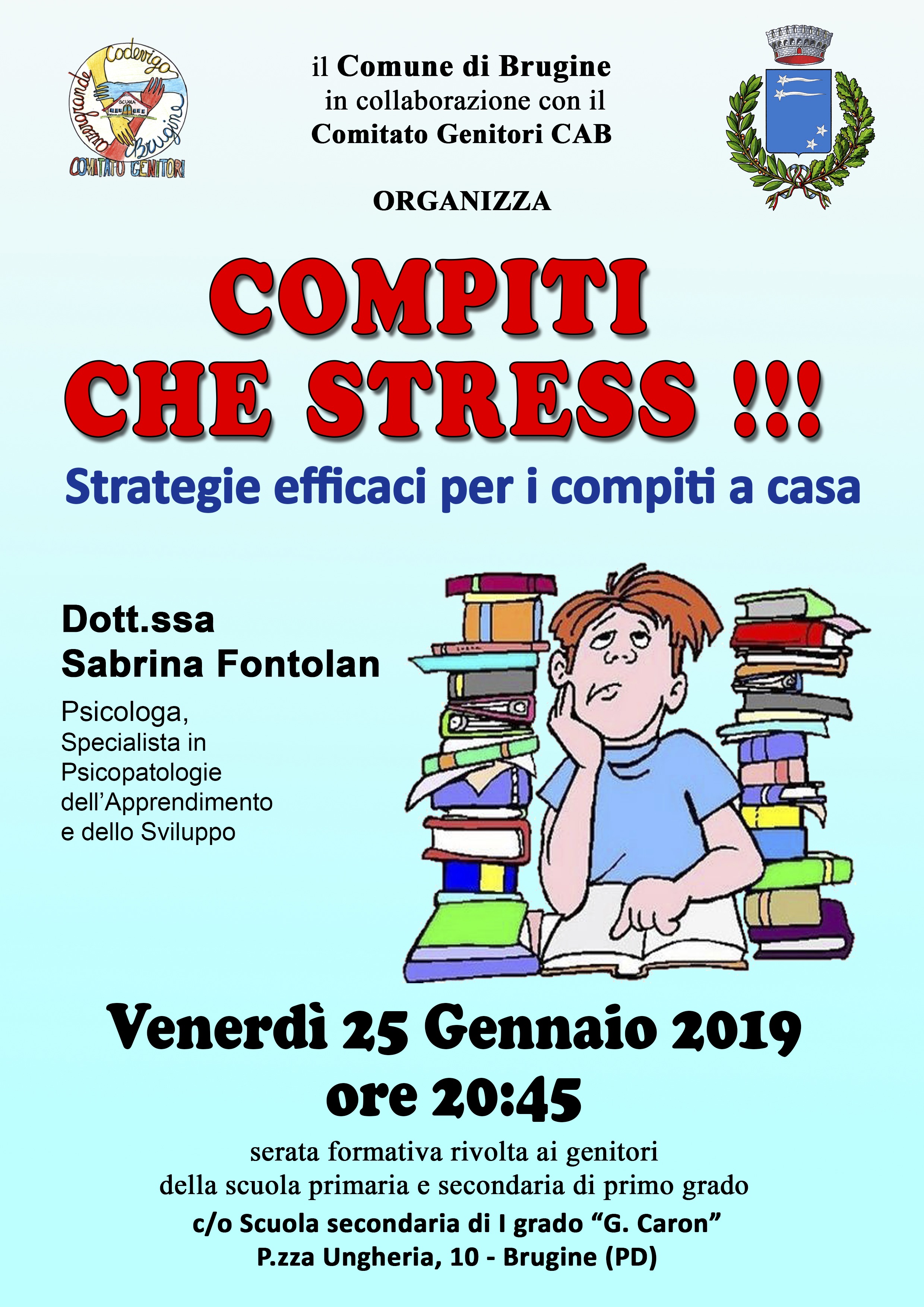 Venerdì 25 Gennaio alle ore 20:45 presso la Scuola "G. Caron" sita in Piazza Ungheria 10, il Comune di Brugine, in collaborazione con il Comitato Genitori CAB, organizza un incontro su strategie efficaci per i compiti a casa, tenuto da Sabrina Fontolan.