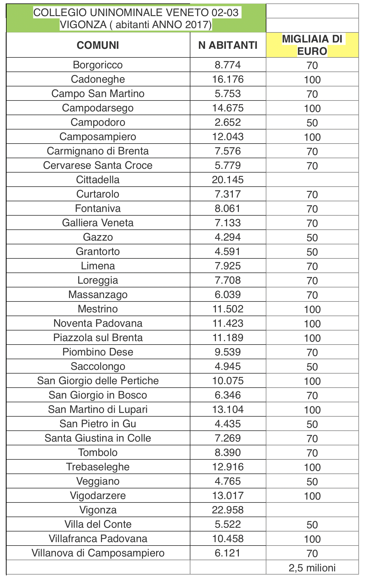 Sono quasi 3 i milioni di euro, veicolati dalla legge di bilancio, che da Roma saranno erogati in favore dei comuni medio-piccoli dell'Alta Padovana e vincolati alla realizzazione di lavori pubblici urgenti come manutenzione di scuole, realizzazione di strade, sistemazione del dissesto idrogeologico. A comuni di piccole dimensioni come Gazzo, San Pietro in Gu, Saccolongo, Campodoro spetteranno 50 mila euro ciascuno. Alla gran parte di comuni dell'Alta (comuni  tra i 5.000 e 10.000 abitanti), arriveranno invece 70 mila di euro. Si tratta di Comuni di medie dimensioni del calibro di Borgoricco, Camposampiero, Santa Giustina, Loreggia, Fontaniva, Curtarolo, Galliera Veneta.