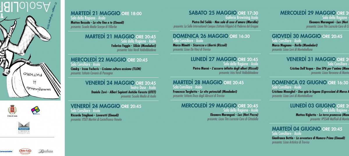 Dal 21 Maggio al 04 Giugno torna Asololibri il festival più atteso e più giovane della Marca! Nel 2019 Asololibri giunge alla XVII edizione e decide di trattare il tempo più difficile di tutti: il futuro. Una coltre di dubbi avvolge gli anni a venire e l’unico modo per diradarla è cercare di pensare al presente e ai temi e ai problemi che avranno un impatto decisivo sulla vita di tutti. La sfida verrà raccolta dagli studenti che provengono da 20 istituti della zona. Come da tradizione, i ragazzi lavoreranno su testi e autori della migliore narrativa e saggistica italiana. Si parte dalle questioni ambientali che riguardano in generale il nostro pianeta, ma in particolare il polmone verde che lo fa respirare: gli alberi, ampiamente trattati nei testi di Daniele Zovi e Pietro Maroè. È importante anche riflettere sui cambiamenti nel mondo del lavoro e della tecnologia: conosceremo il padre del microprocessore Federico Faggin, un attento osservatore della new economy come Riccardo Staglianò e il finalista del Premio Campiello 2018 Francesco Targhetta che nel libro ‘Le vite potenziali’ racconta la generazione dei NEET. La sfida che l’intera Europa dovrà affrontare nel prossimo futuro è quella dei flussi migratori: Asololibri ospiterà l’ex Ministro dell’Interno Marco Minniti e un romanziere come Matteo Righetto che narra l’epopea dei migranti veneti. Non manca né la narrativa di formazione (Matteo Bussola, Eleonora Marangoni e Gianfranco Bettin), né, ovviamente, quella distopica (Marco Magnone). E se la cultura è l’ultima difesa da un futuro incerto, allora sono importanti le lezioni della blogger Irene Facheris, del giornalista Pietro Del Soldà e della professoressa Cristina Dell’Acqua. Il festival è impreziosito dalla meravigliosa cornice medievale del borgo di Asolo con i suoi scorci mozzafiato, la sua storia e i suoi incredibili monumenti. Asololibri: una riserva per chi leggerà anche in futuro!