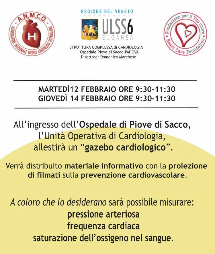 Questa è la "Settimana del cuore" e per l'occasione l'ULSS6 Euganea ha messo in programma martedì 12 e giovedì 14 febbraio, fuori dell’Ospedale di Piove di Sacco, un “gazebo cardiologico” dove sarà possibile ricevere materiale informativo per la salute del cuore. Gli specialisti del reparto di Cardiologia, inoltre, saranno a disposizione per delle consultazioni individuali, con misurazione della pressione arteriosa, frequenza cardiaca, saturazione dell’ossigeno nel sangue.