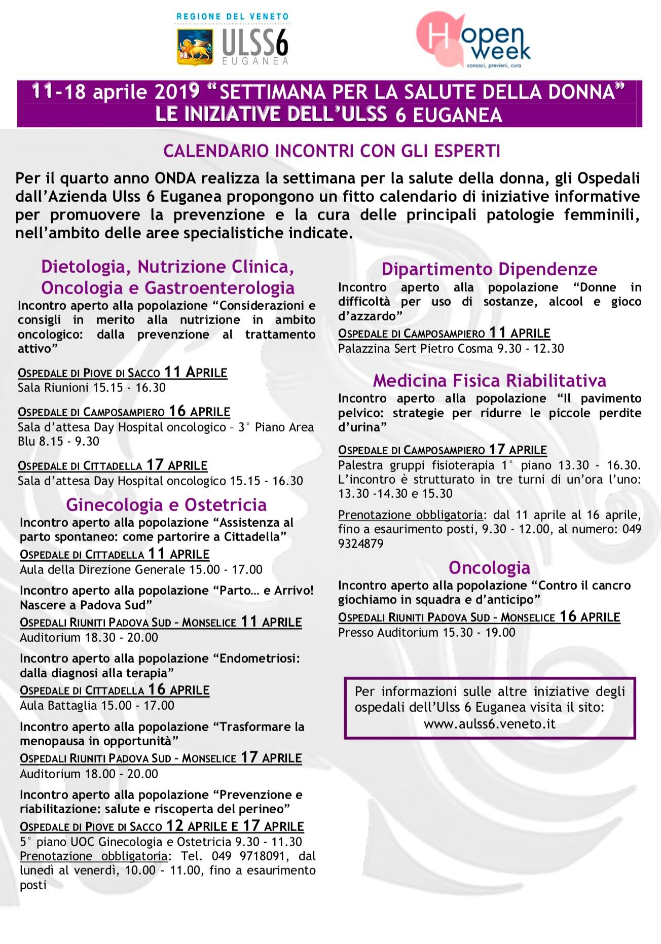 In programma dall’11 e il 18 aprile la “Settimana per la salute della donna”, in collaborazione con Onda - Osservatorio nazionale sulla salute della donna e di genere. Nei nostri presidi ospedalieri un fitto calendario di incontri informativi e prestazioni sui temi di salute della donna negli ambiti di dietologia e nutrizione, ginecologia e ostetricia, oncologia, senologia, medicina fisica e riabilitazione, reumatologia, endocrinologia, cardiologia, diabetologia. Vengono anche proposti incontri informativi e colloqui individuali su disagio psicologico, sulla difficoltà nel rapporto con figli adolescenti problematici, sulle dipendenze da gioco, alcool e sostanze.